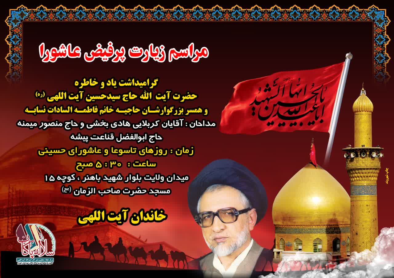سلاله پاکان : همزمان با روز تاسوعا و عاشورای حسینی ویژه برنامه زیارت پرفیض عاشورا ، به یاد آیت الله حاج سیدحسین آیت اللهی (ره)، امام جمعه فقید جهرم و همسر بزرگوارشان حاجیه خانم فاطمه السادات نسابه در مسجد حضرت صاحب الزمان (عج) جهرم برگزار خواهد شد.